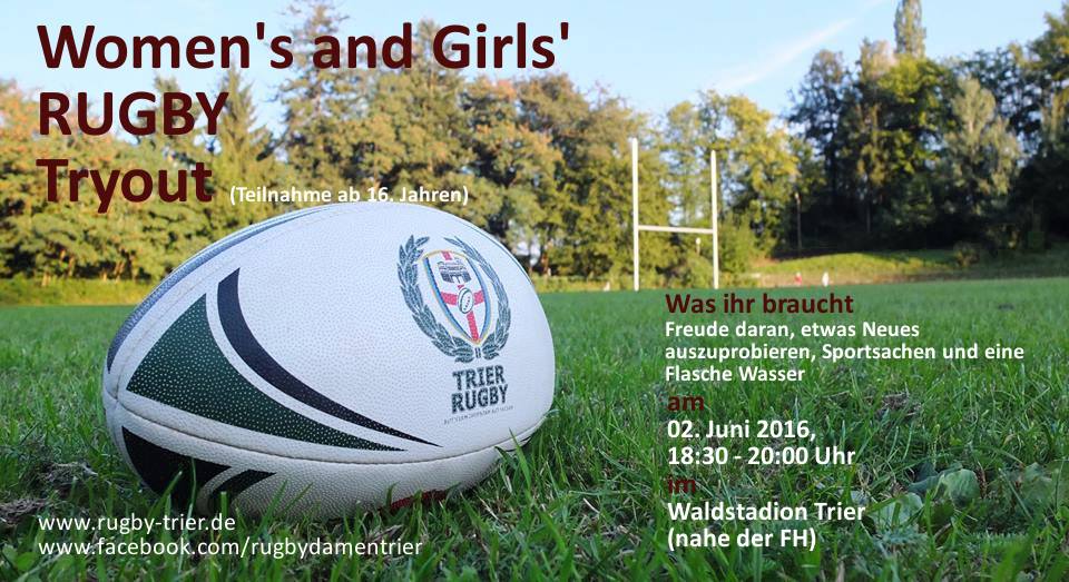 Hast du Lust, etwas Neues auszuprobieren, dich auszupowern und neue Leute zu treffen? Dann komm doch am 02. Juni 2016 zu unserem Rugby Tryout / Probetraining um 18:30 Uhr ins Waldstadion.